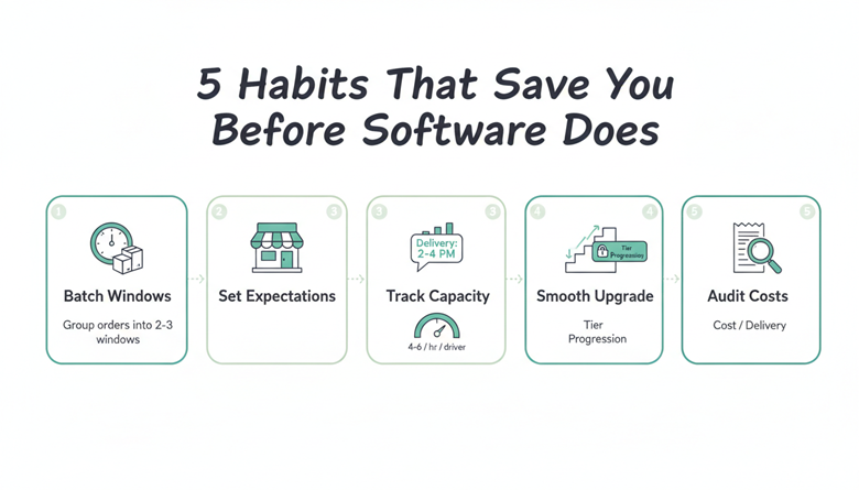 Batch your delivery windows. Group orders into two or three windows per day instead of dispatching one at a time. This cuts drive time and fuel costs immediately.